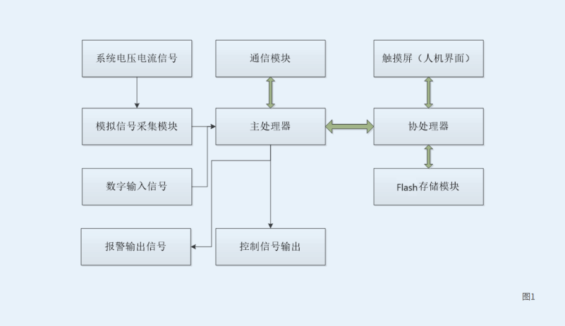 本装置由电源模块,模拟信号采集模块,数字信号输入模块,继电器信号输出模块,开关量采集模块,主处理器模块,协处理器模块,通信模块,Flash存储模块等部分组成,如图: